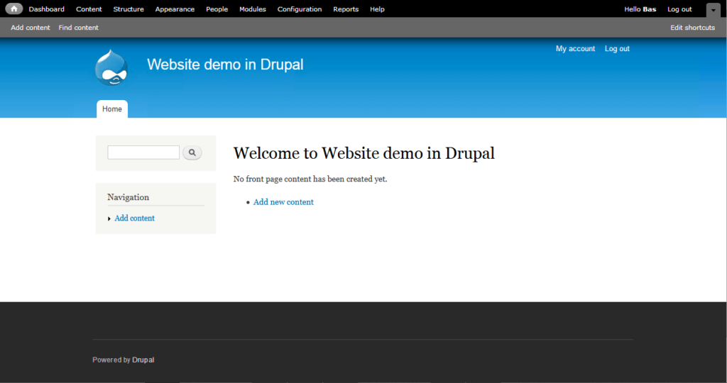 U bent nu op uw website en via de bovenstaande menu-tabbladen kunt u aan uw Drupal website werken.
